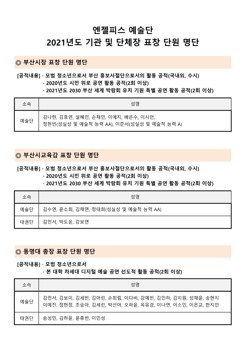 2021년도 기관 및 단체장 표창 단원 명단