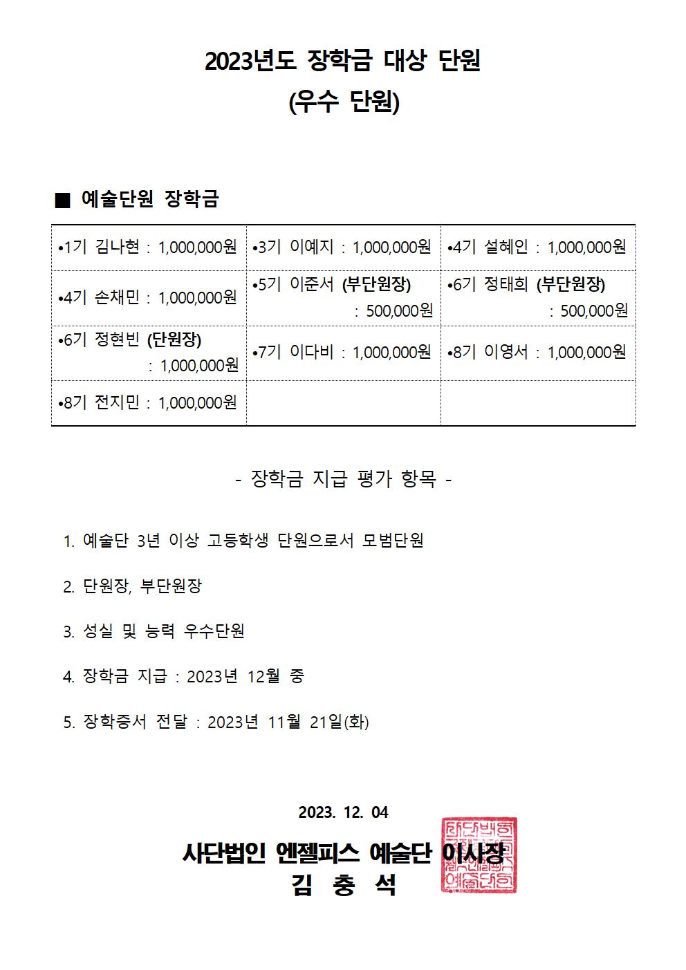 엔젤피스 예술단 제11기(3차) 최종 합격자 공고