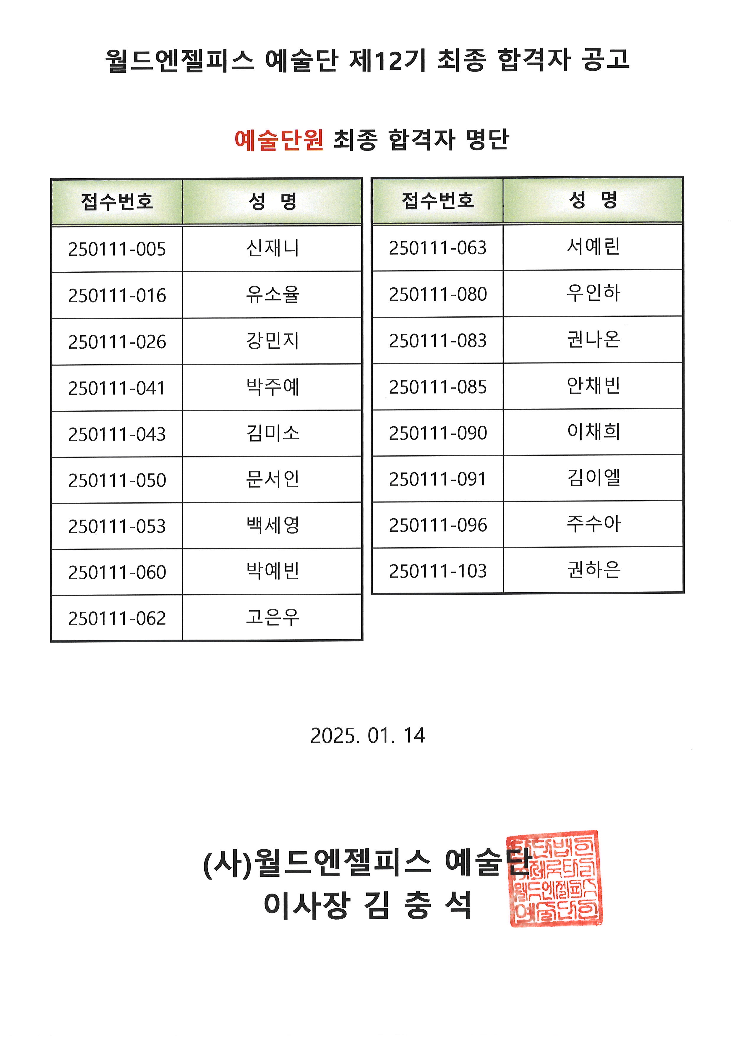 월드엔젤피스 예술단 제12기 최종 합격자 공고