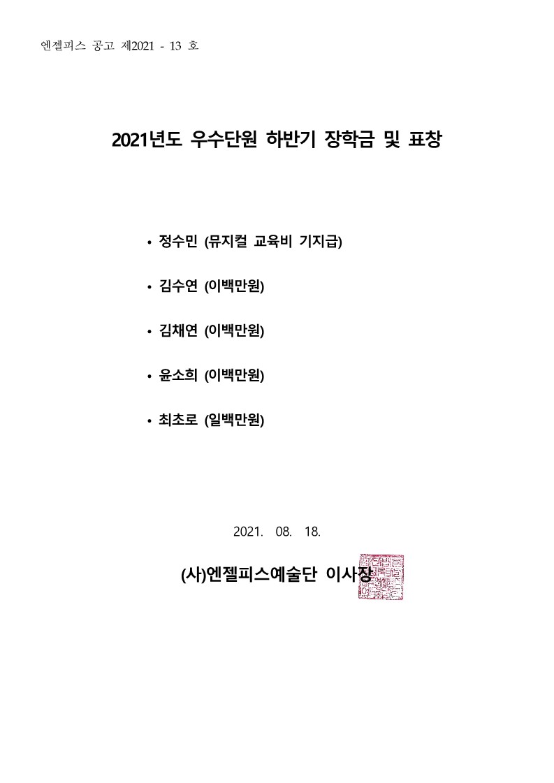 2021년 우수단원 하반기 장학금 및 표창