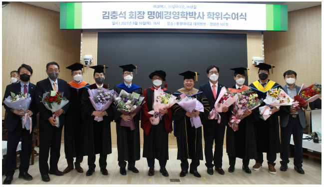 동명대는 16일 대학본부경영관 107호에서 김충석 (주)코팩스 ㈜일바이오 ㈜한길 회장(엔젤피스예술단 이사장)에 명예 경영학 박사 학위를 수여했다.