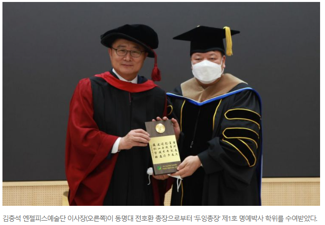 [아시아경제 영남취재본부 김용우 기자] 김충석 엔젤피스예술단 이사장이 동명대에서 명예 경영학박사 학위를 받았다.