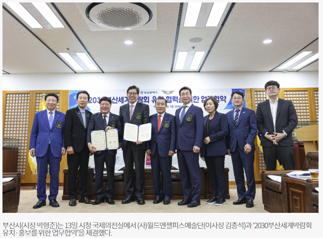 부산시(시장 박형준)는 13일 시청 국제의전실에서 (사)월드엔젤피스예술단(이사장 김충석)과 ‘2030부산세계박람회 유치·홍보를 위한 업무협약’을 체결했다.